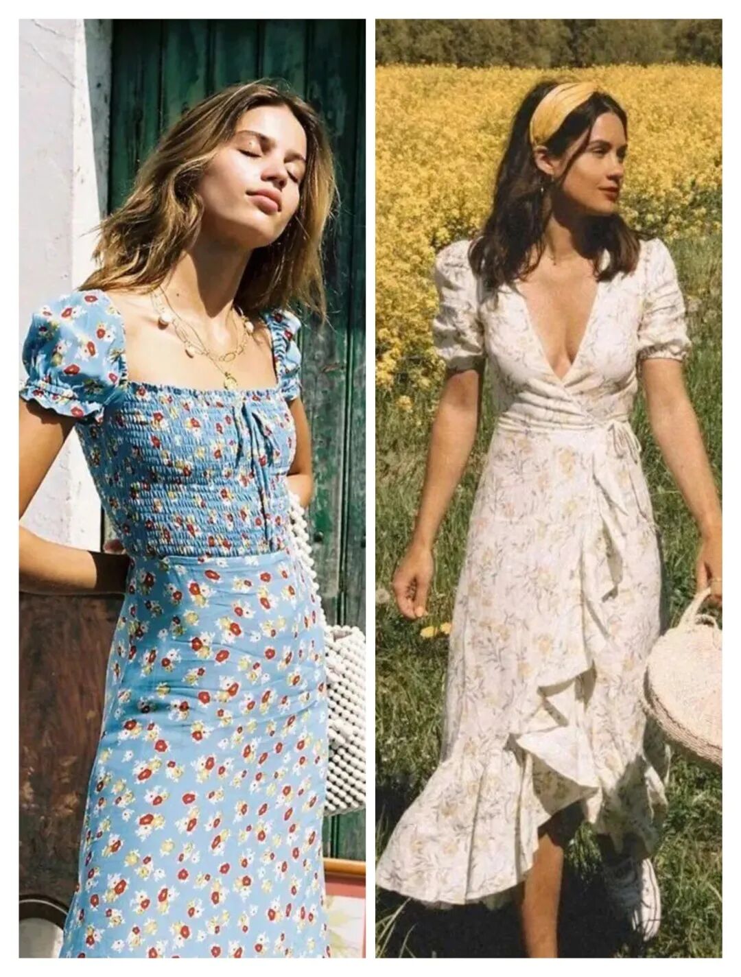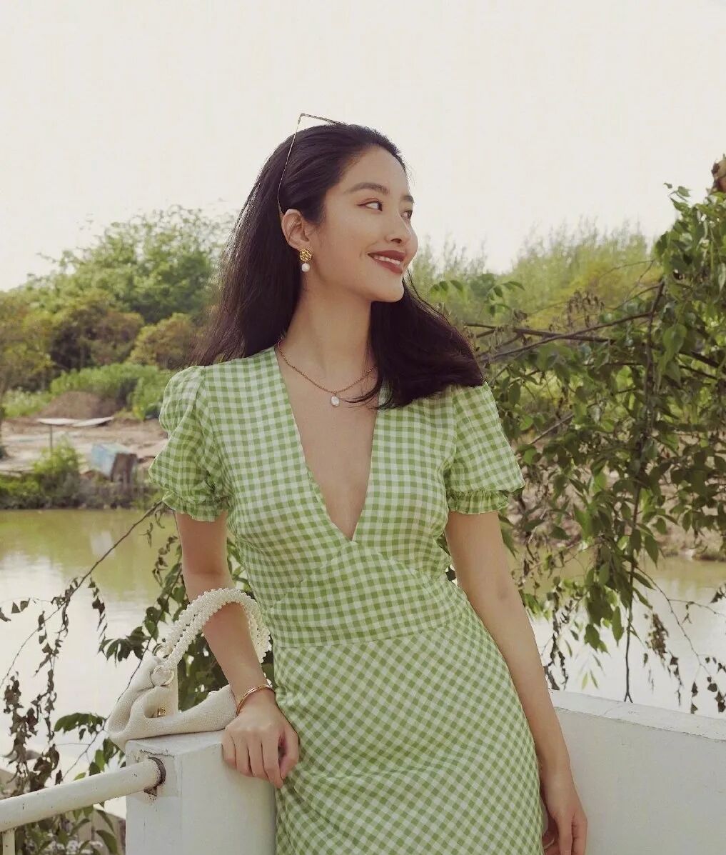 像茶歇裙、方领泡泡袖这种具有法式元素的裙子,也很适合瓜子脸,随性的同时增加少女气息。