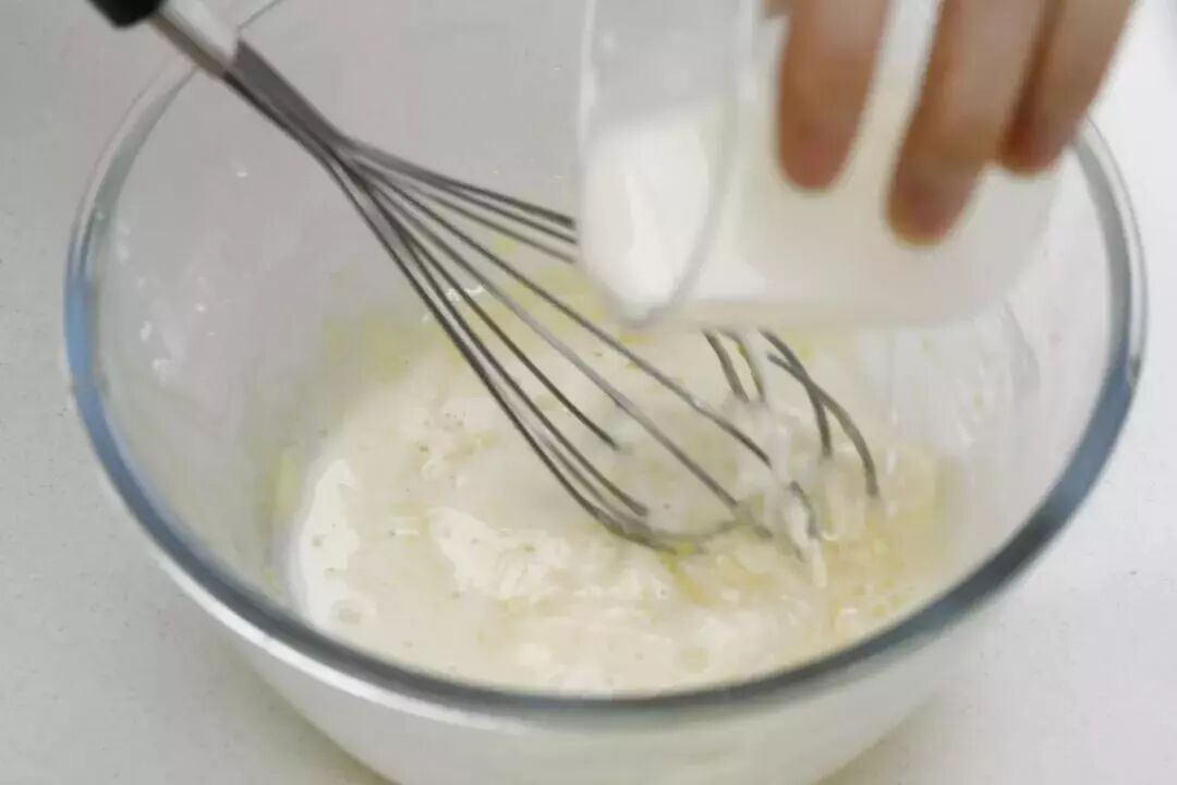 3. 筛入30g低筋面粉,用手动打蛋器划“Z”字的手法混合至无干粉状。