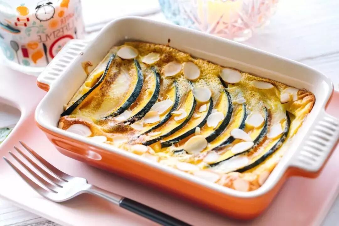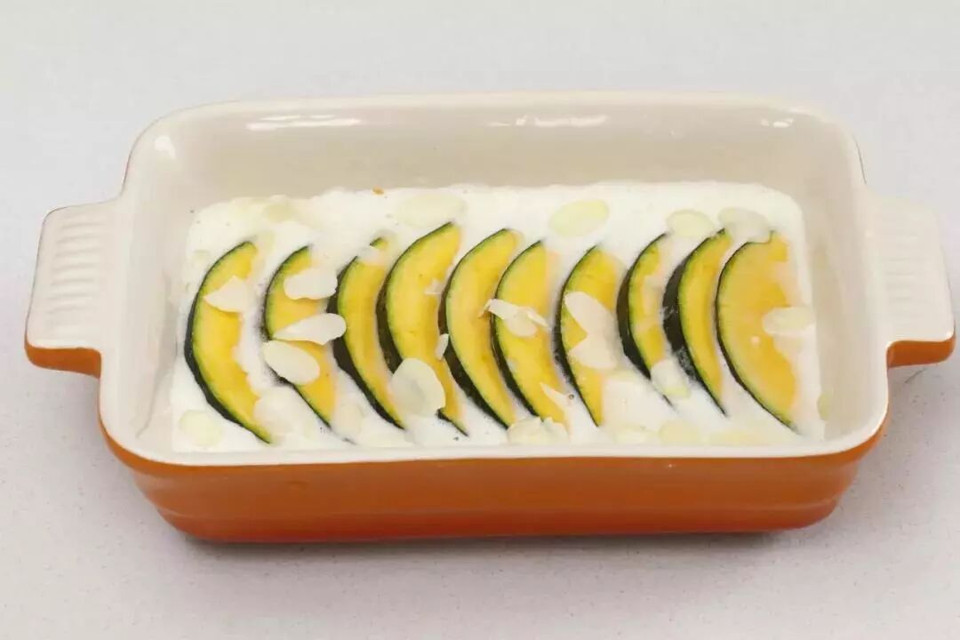6. 在陶瓷烤碗中,铺上适量的南瓜片,倒入混合液,表面再撒少许杏仁片做装饰。