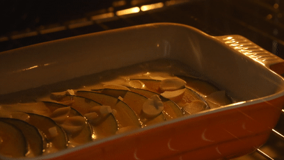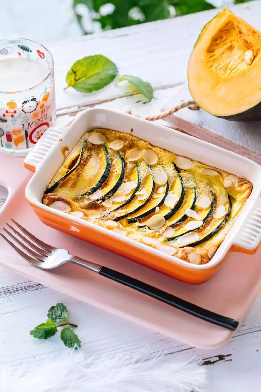 6. 在陶瓷烤碗中,铺上适量的南瓜片,倒入混合液,表面再撒少许杏仁片做装饰。