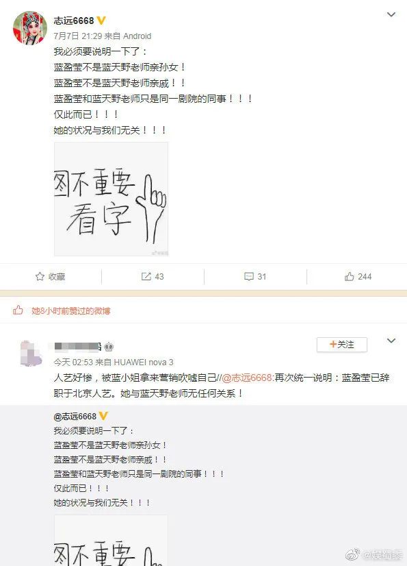 过程大概是这样的:蓝盈莹被曝从北京人艺辞职,但是还发图文误导群众自己是蓝天野的孙女,沾蓝天野前辈的光。