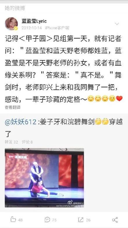 随后陈年微博也被粉丝们挖了出来,蓝盈莹早在12年的时候就澄清过,自己并不是蓝天野的孙女。