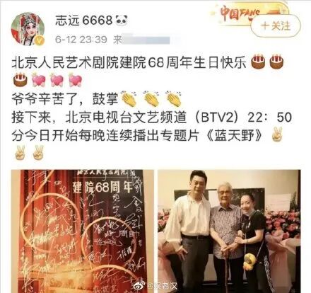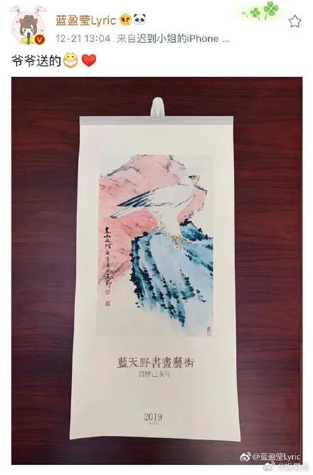 看她12年发的一条微博,也就是发了一本挂历,就说是爷爷送的。(这个爷爷指的是蓝天野)