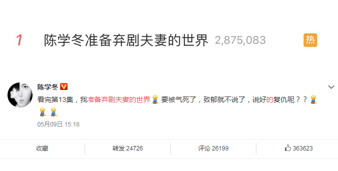 最高分时冲上9.1,现在有点小回落,也无碍这部剧的高分设定。不光是大象爱追,连不少明星也纷纷入坑,像昨天上了热搜的陈学冬。