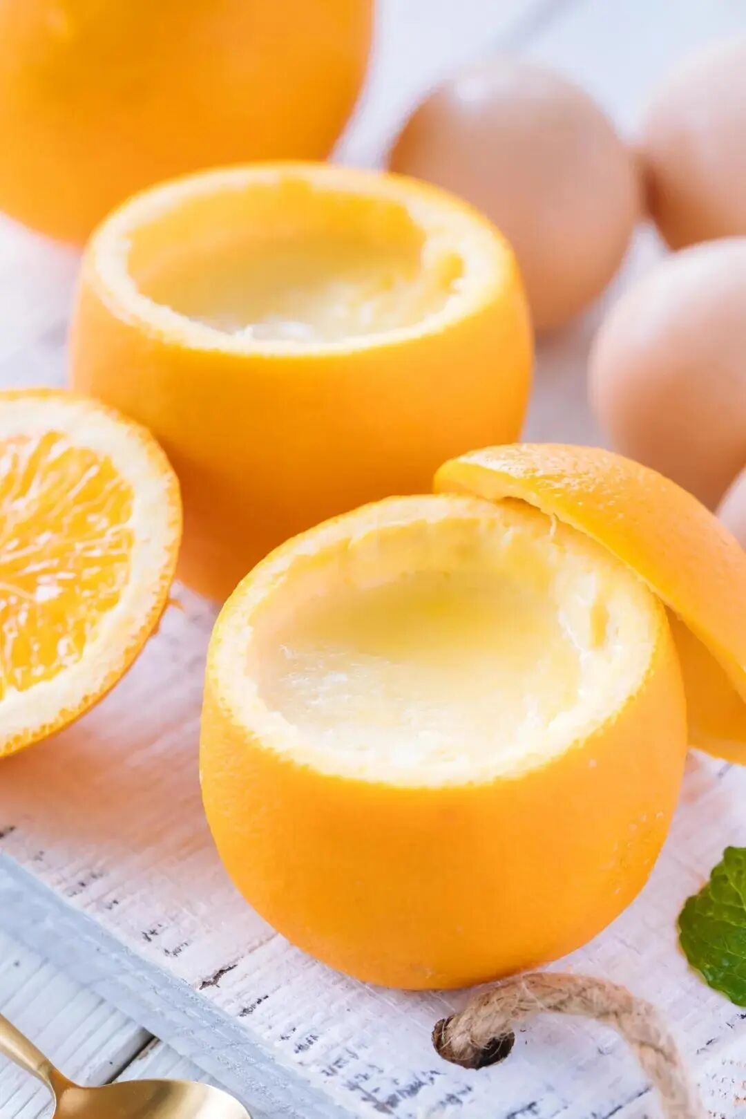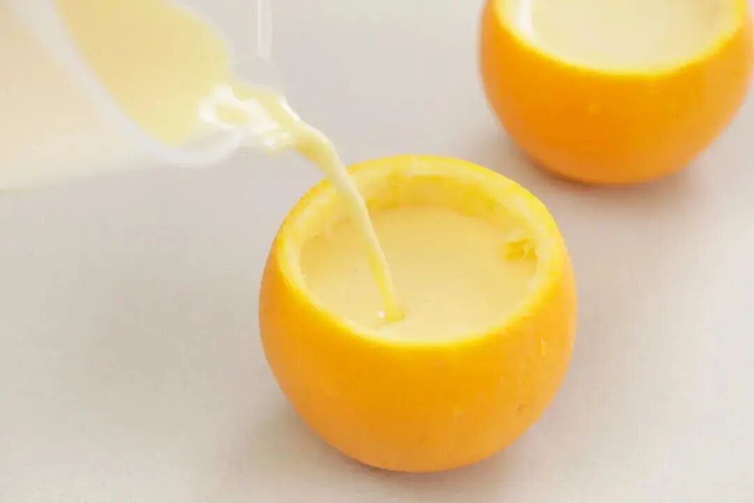 6. 把蛋奶液倒入橙子碗中约8分满。