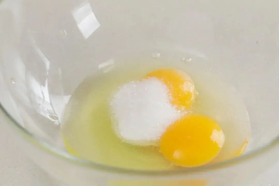 3. 2个鸡蛋加20g细砂糖打散。