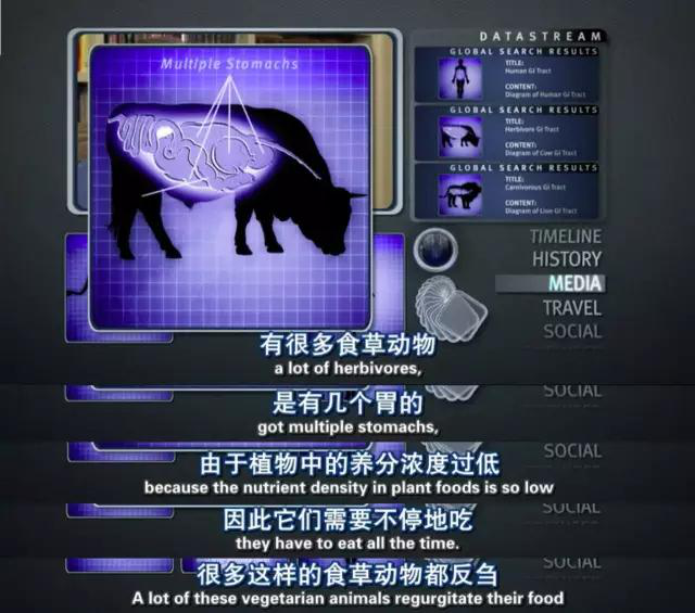 但医学博士C.J.Hunt(迈克尔)却在美国纪录片《The Perfect Human Diet》中说到,食草动物往往拥有几个胃,因为植物中的营养含量很低,为了获取足够的能量,它们必须一直不停地吃吃吃。