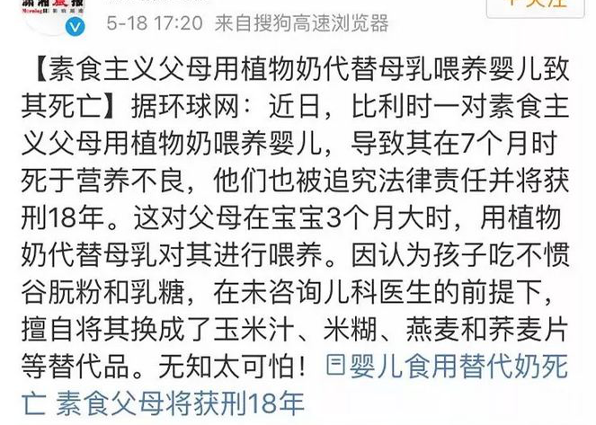 比利时一对纯素食主义父母用植物奶喂养婴儿,导致婴儿在7个月时死于营养不良。