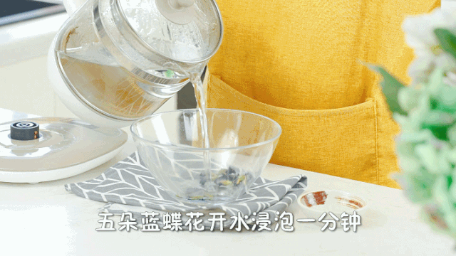 1、5朵蝶豆花用350ml开水浸泡一分钟
