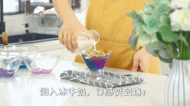 但正因为几乎人人能做,人们的创造性和口味的差异性,也导致冰粉的花样多了起来,而今天我要做的就是一款颜值超高的:渐变星空海洋冰粉。