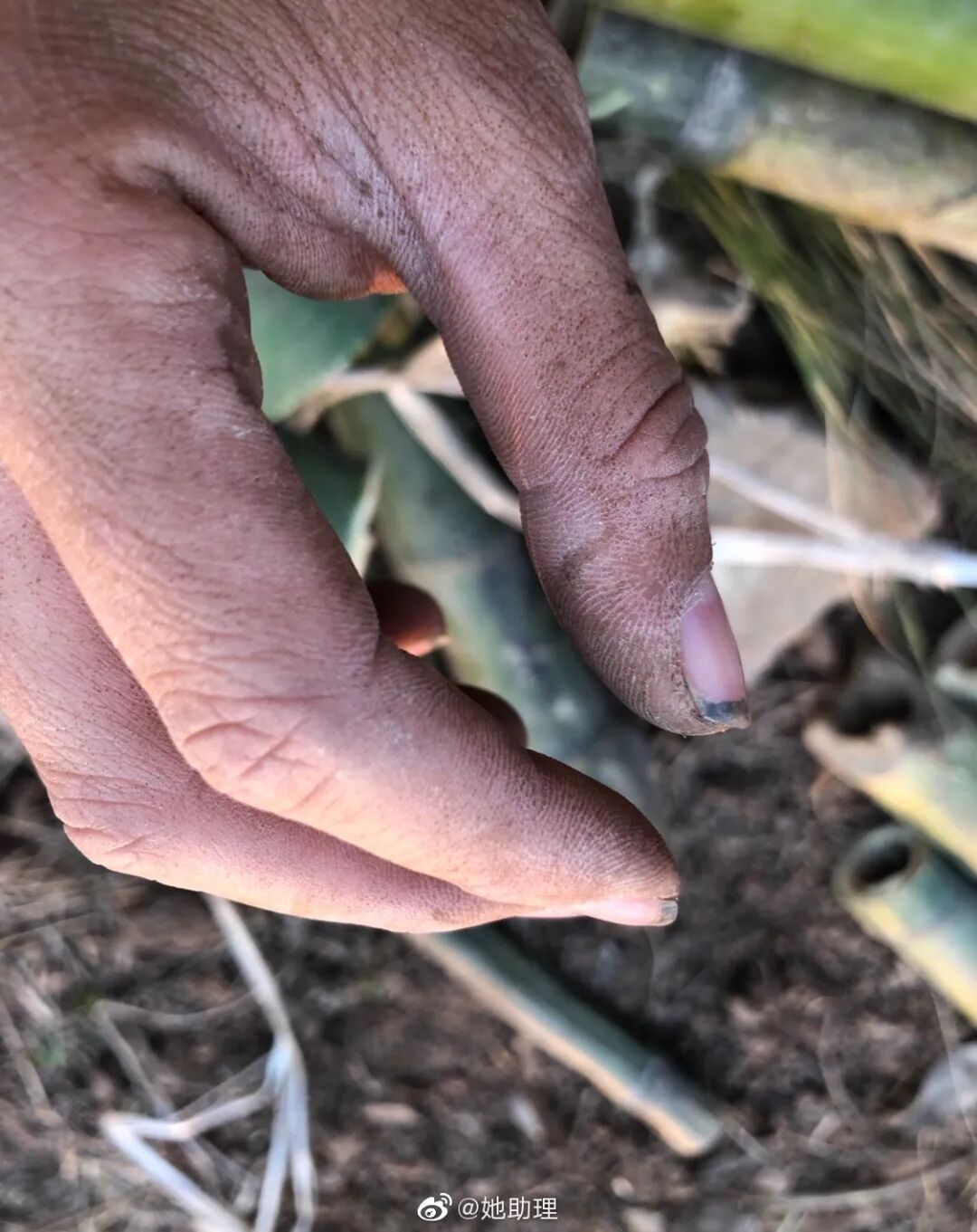 没有看到,子柒因长期干农活,长满茧、沾满泥土灰的双手;