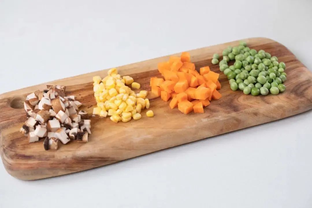 6.4朵香菇洗净切成丁,100g胡萝卜去皮切成粒 ,100g玉米粒、100g豌豆洗净待用。