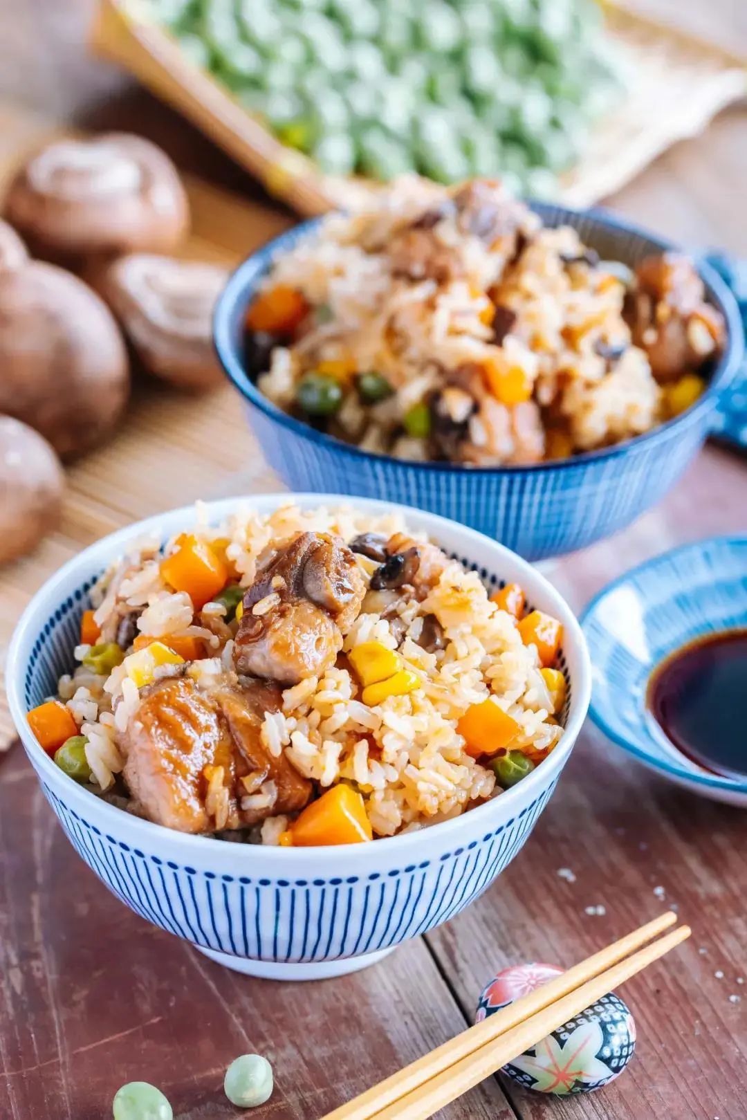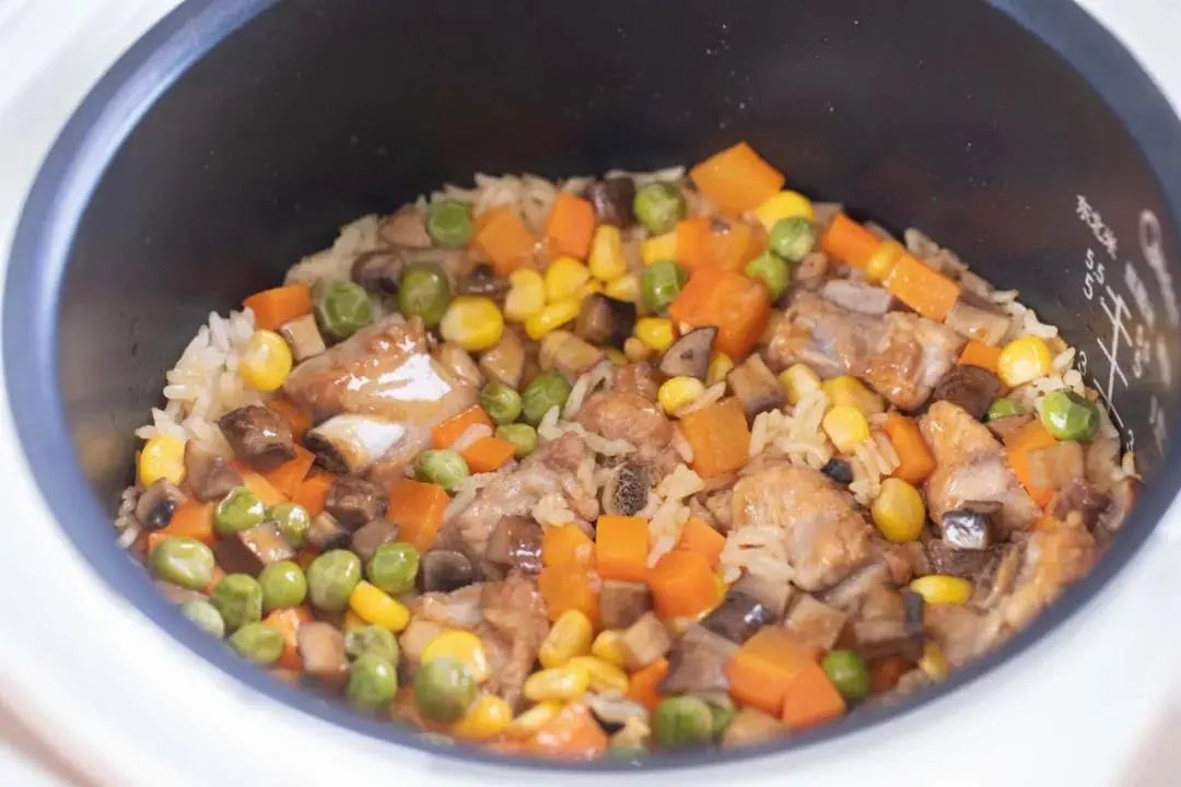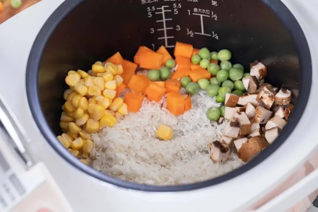 7.电饭煲内放入200g淘洗干净的大米,再放入香菇丁、胡萝卜粒、玉米粒和豌豆。