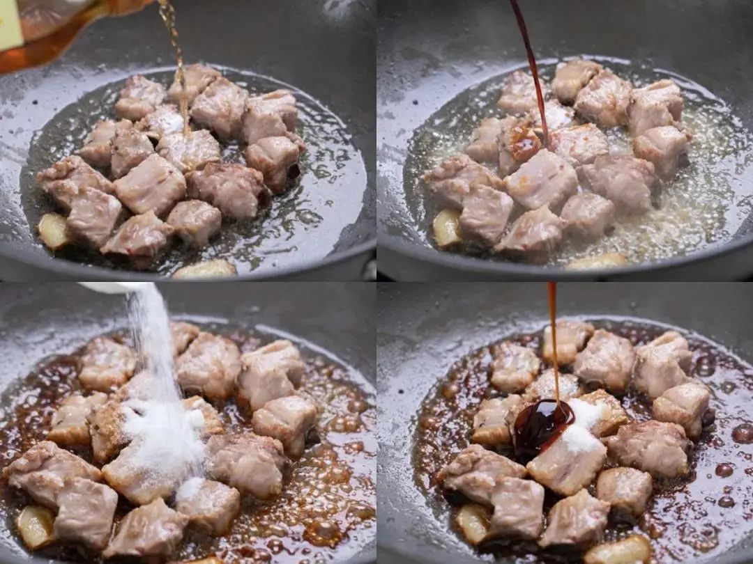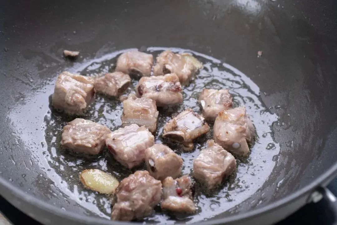 2.200g排骨洗净,加入热锅中大火炒至两面金黄。