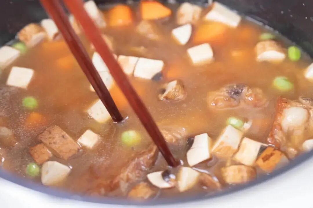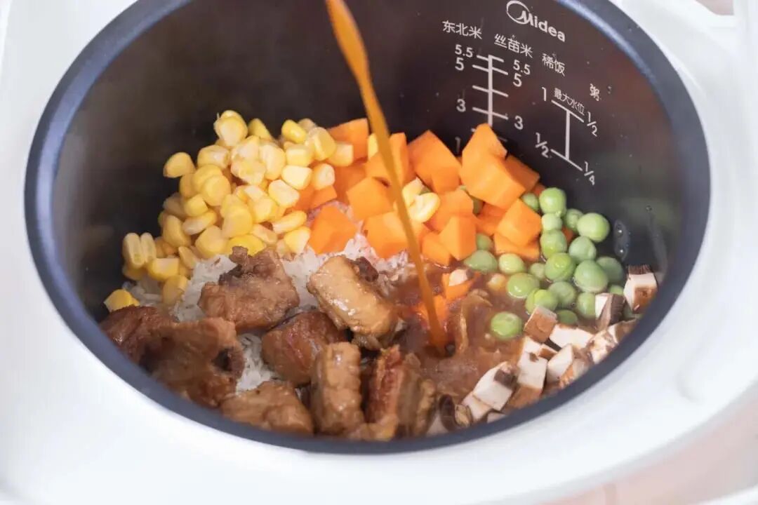 8.排骨连汤一起倒在米饭上,汤汁大约没过大米一食指节。