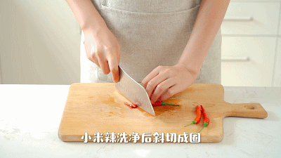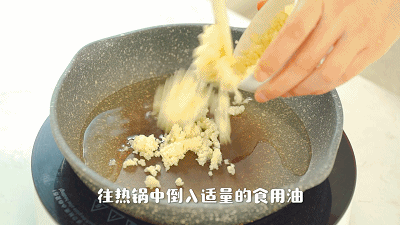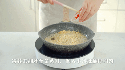 3. 热锅倒油,下一部分蒜末爆香,待蒜末炒至金黄后,加入小米辣翻炒均匀