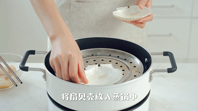 5. 将洗净的扇贝壳放入蒸锅中,依次铺上泡软的粉丝、扇贝肉和蒜蓉酱,再加上少许小米辣,盖上盖子,冷水上锅蒸15分钟