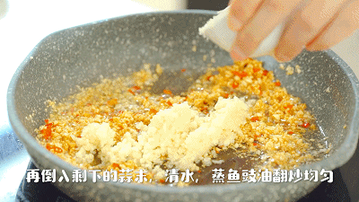 4. 往锅中倒入剩下的蒜末、适量清水和蒸鱼豉油翻炒均匀,蒜蓉酱就准备好啦
