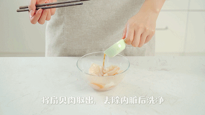 2. 将扇贝肉取出,去除内脏后洗净,倒入料酒腌制10分钟