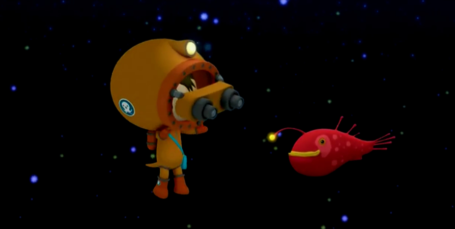 皮医生发现了会发光的斧头鱼,但是看不到小鲨鱼的身影,仔细找了一下,发现和大家走失了。他马上呼叫队长,但因为在深海,无线信号不好,联系不上大家。