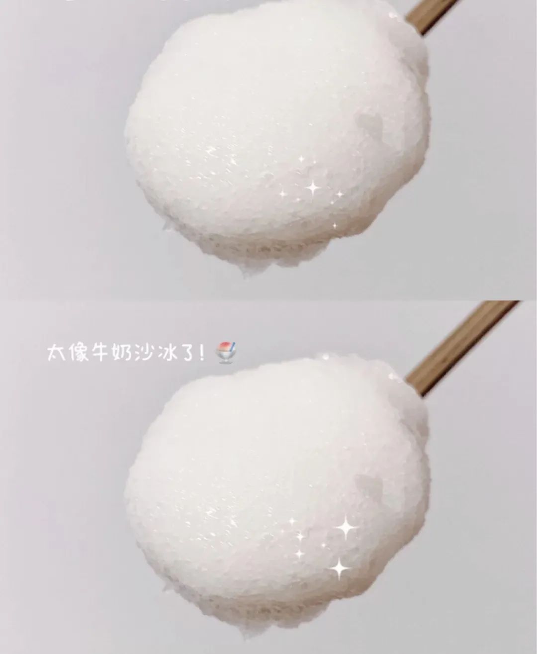 挖出来的海盐粒在湿水后就能变成超绵密的泡沫,光是看着就很赏心悦目啦!(温馨提醒:自备起泡网效果会更佳)