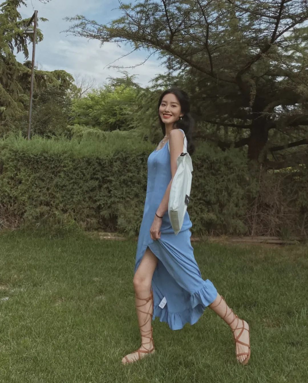 像吊带连衣裙就是夏天的标配了,为整体带来了轻盈感和清爽感不说,水蓝色的颜色也显白,溢出屏幕的质感,简约但又不会让你丢掉时尚。