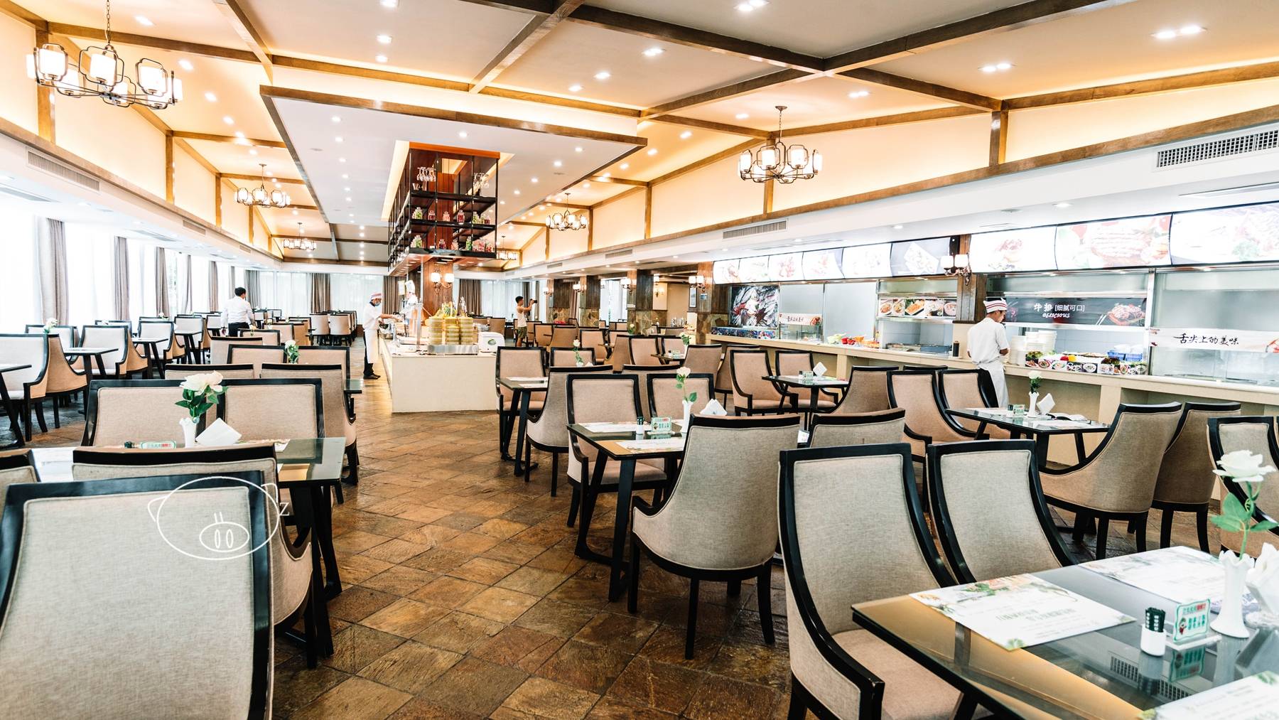 【交通】京港澳高速,佛冈出口右转4公里,度假区里有大量停车位。【环境】位于酒店主楼大堂一楼,服务台后面位置,三个食品区,一个是西点,一个是熟食,扒类、面食等现点现做,餐厅较大,环境舒适,椅子坐着舒服。【服务】服务员会经常巡,帮收拾用完餐的碟子。【口味】食品区品种较多,不过高档食材不多,没有海鲜。西点区点心很多,做的很精致,看着有食欲,寿司、沙拉、水果也是不少;熟食区以各种肉类为主,鸡、鸭、鹅、鱼等,还有汤和甜品;现点是煎牛扒和配上牛腩、肉末等的粉面。【综合】这个自助餐厅挺大,大厅装饰很有特色,服务员多,只提供早晚餐,没有提供午餐,没有高档食材,都是些常规的食品,西点做得比较好,早餐品种也是挺多,作为景区内的配套餐厅,价格是可以接受的。18:00开始用餐,早点来位置容易找,食材会不断补充,也不用担心没得吃。📍 森波拉酒店西餐厅,清远市佛冈森波拉度假森林