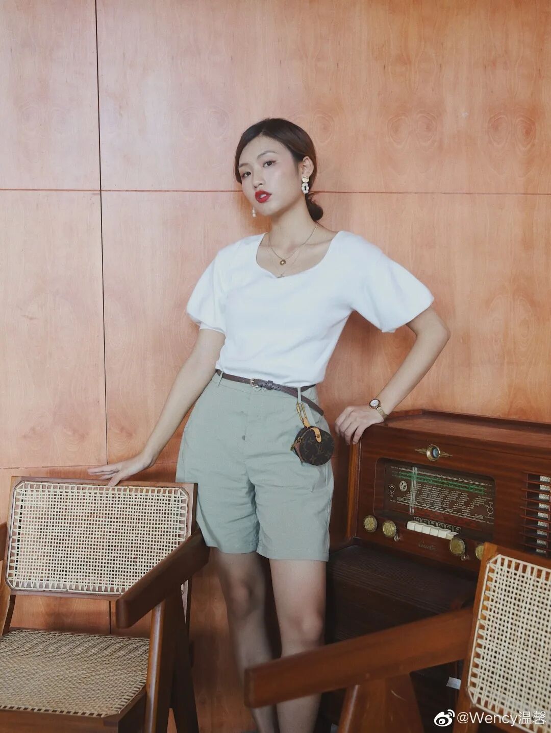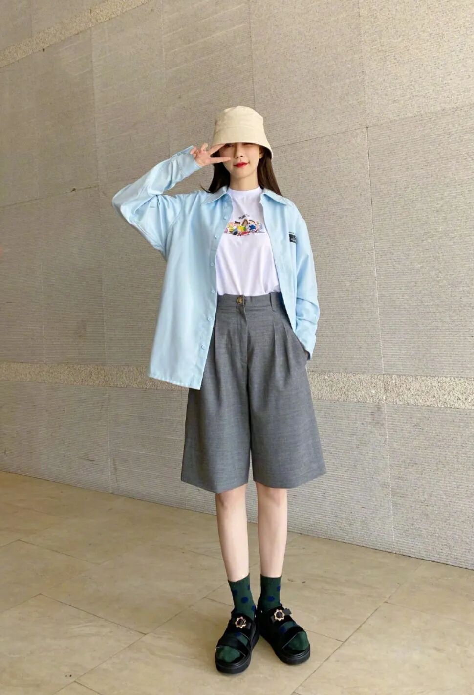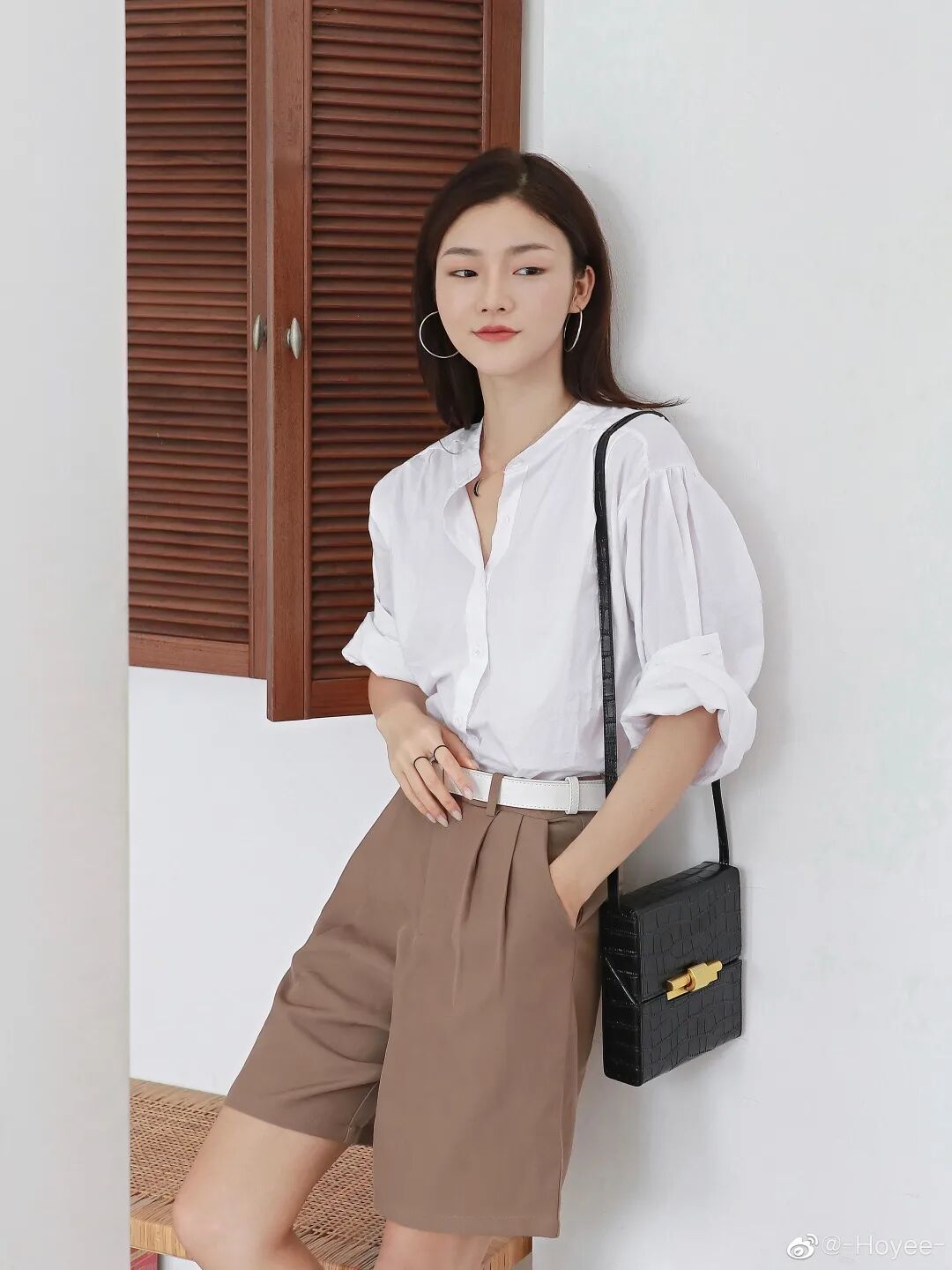 如果想走轻熟风,可以把T恤换成衬衫,基础款衬衫+百慕达短裤可以出现非常优雅大气的风格。