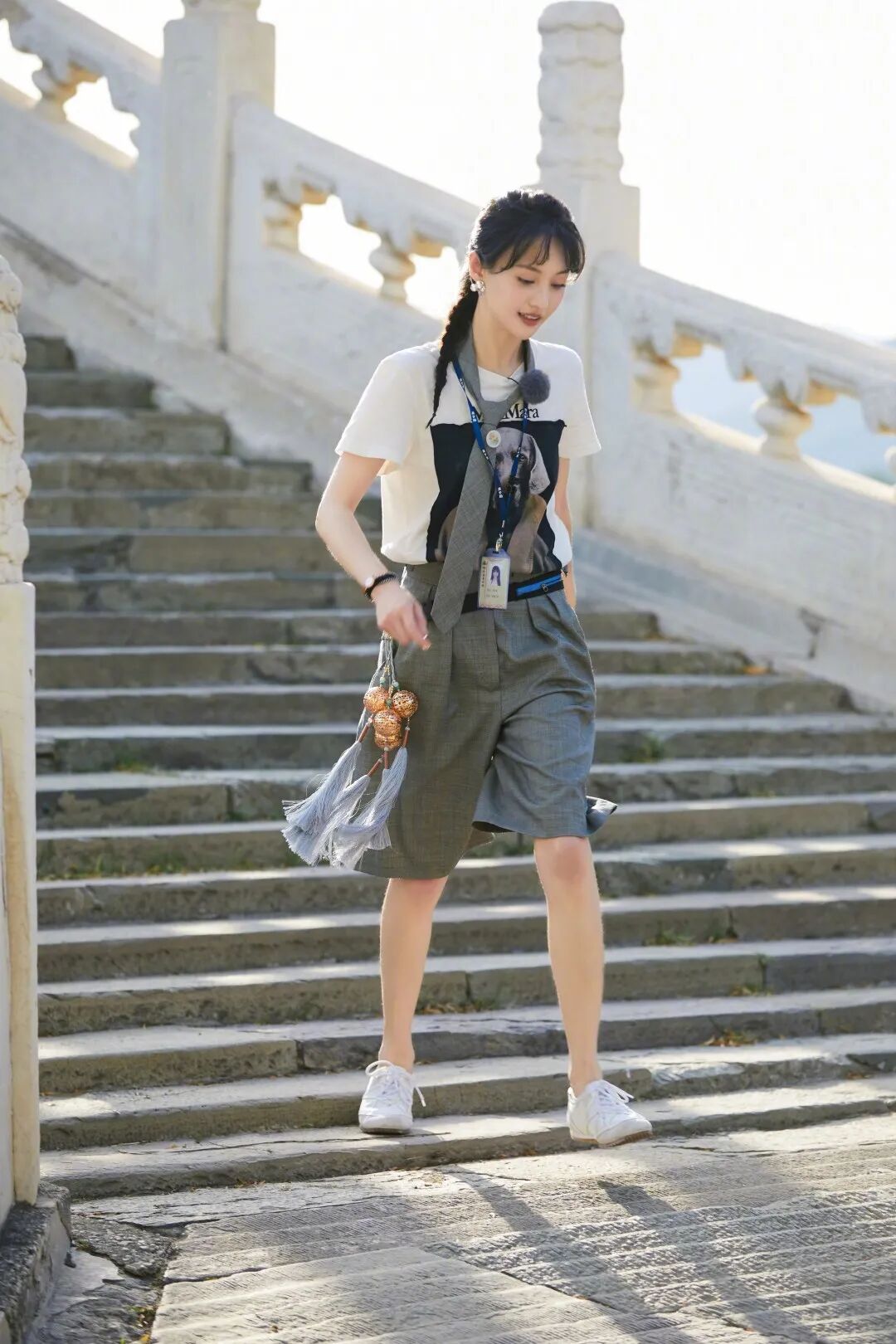也可以学郑爽,选一件卡通款的T恤,结合小领带进行装饰,也是非常不错的哦!多了一些童趣的色彩。