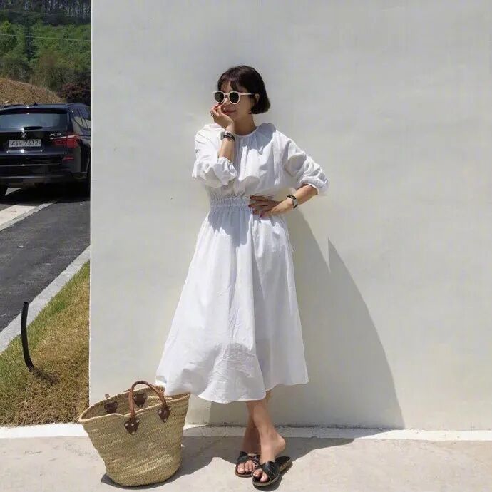 小白收腰裙不挑人,简答搭配一双休闲的黑色凉拖,简约又不失大方。