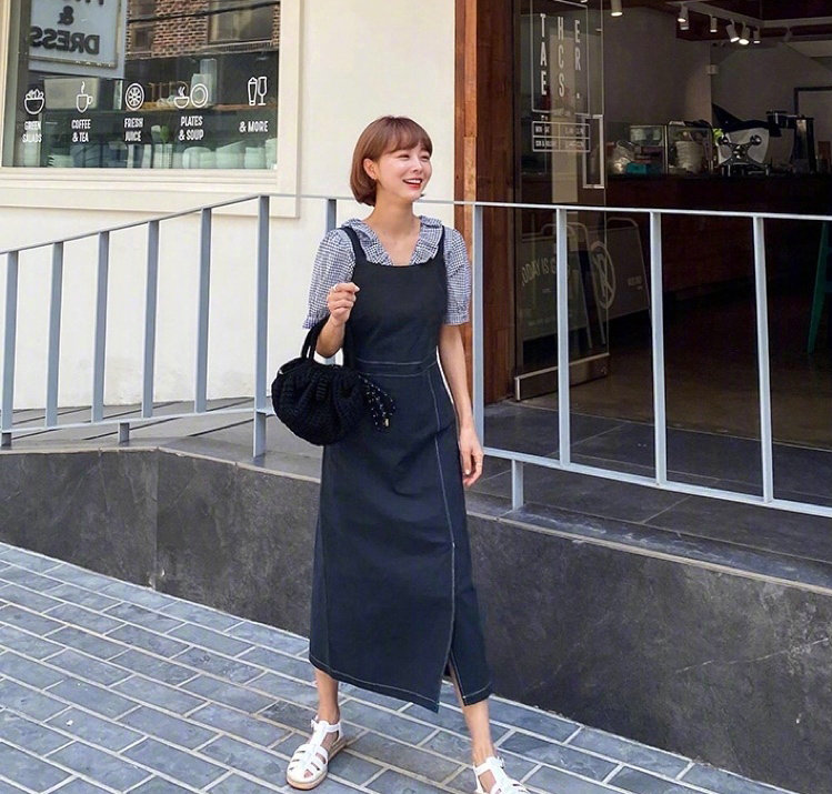 本来是一条比较简约性冷淡风的牛仔吊带,但是加上了荷叶边打底衫后,风格就可爱多了: