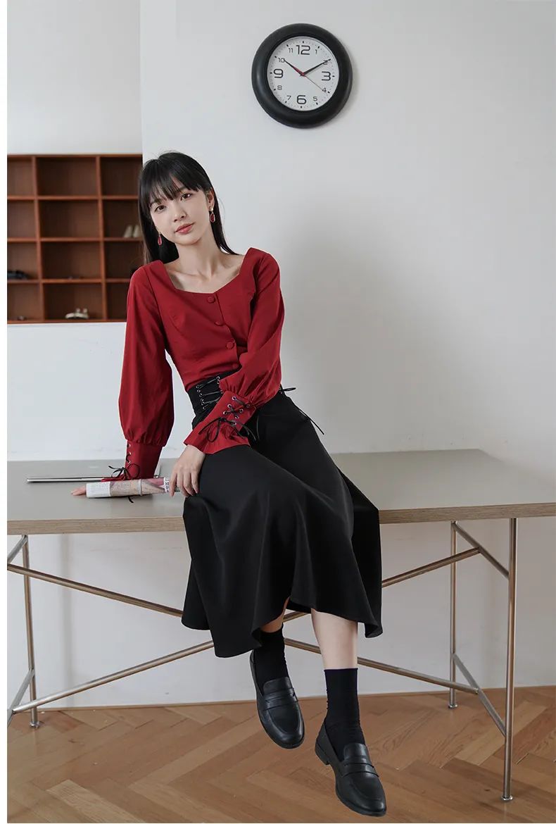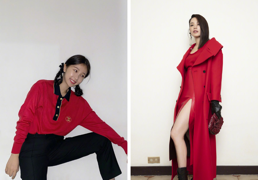 大面积的红色会使人视觉疲劳,适当露肤、留白,可以营造视觉上的缓冲。