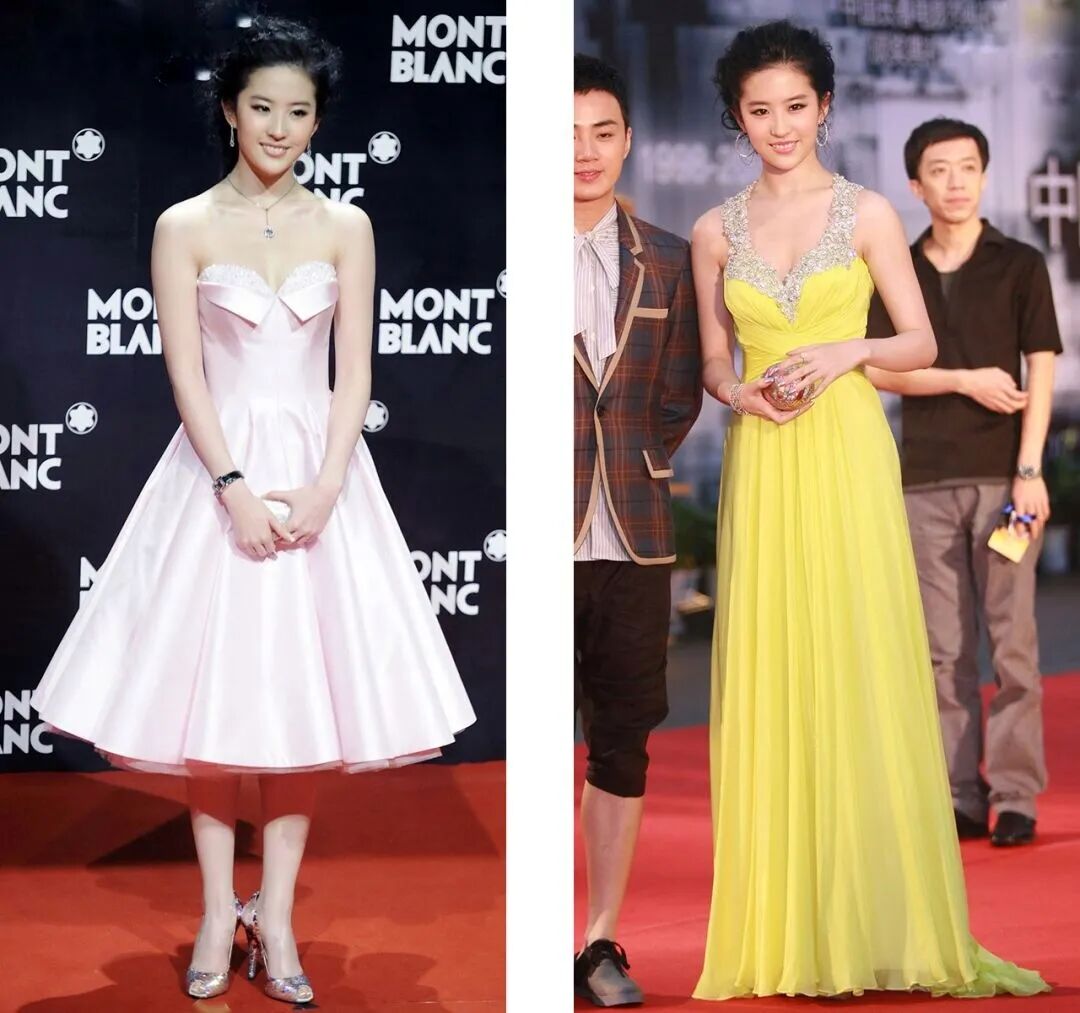 早年出席活动影楼风的造型真的有点辣眼睛,礼服材质廉价,像裹了一层塑料布在身上。