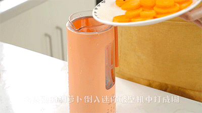 3. 将蒸熟的胡萝卜压碎成泥糊状,或放入破壁机中打成糊