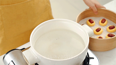 6. 将半个红枣压入面团,顺便将其压扁一点,冷水上锅蒸20分钟即可