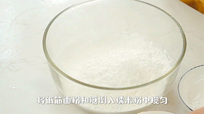 4. 将低筋面粉、糖和糯米粉搅匀,加入胡萝卜糊拌匀揉搓成光滑的面团