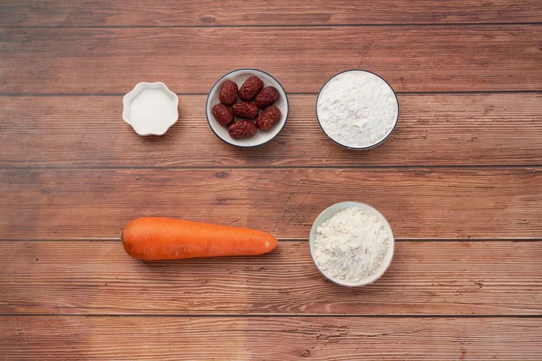 胡萝卜1根(去皮后约200g) 红枣8颗 糯米粉130g 低筋面粉60g 糖15g
