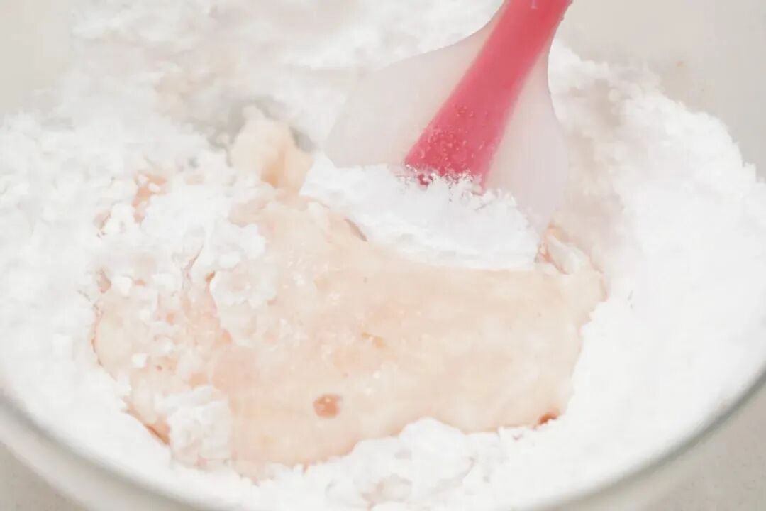 4、再加420g木薯淀粉,先用刮刀翻拌成絮状。