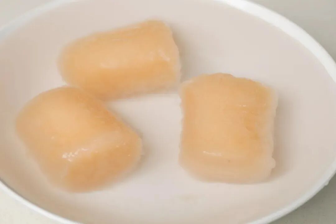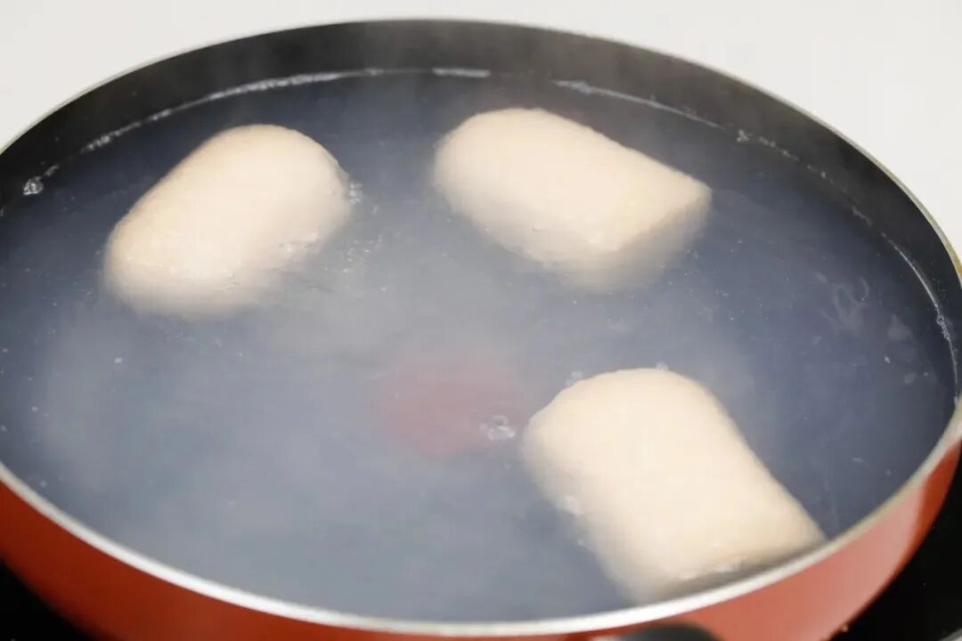 7、切成三段,放入沸水中,煮至浮起,转中火继续煮10分钟。