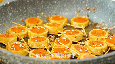 黄色的豆皮,裹卷着红色的香肠,再加上固定形状的牙签,乍一看,还真有点像棒棒糖呢。
