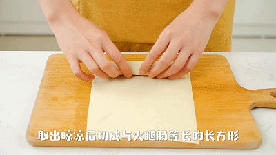 2. 将豆皮切成跟火腿肠等长的长方形,再将火腿肠卷起来