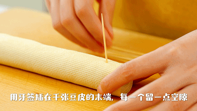 3. 用牙签插在千张豆皮的末端,每一根留一点空隙,然后将豆皮卷沿着空隙按顺序切开