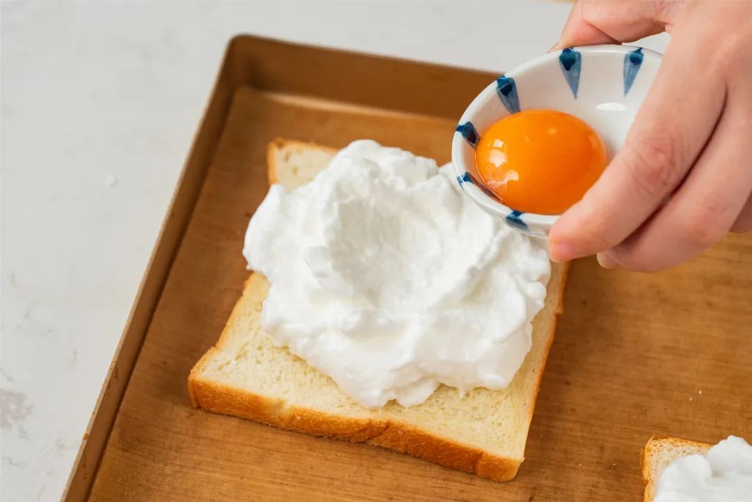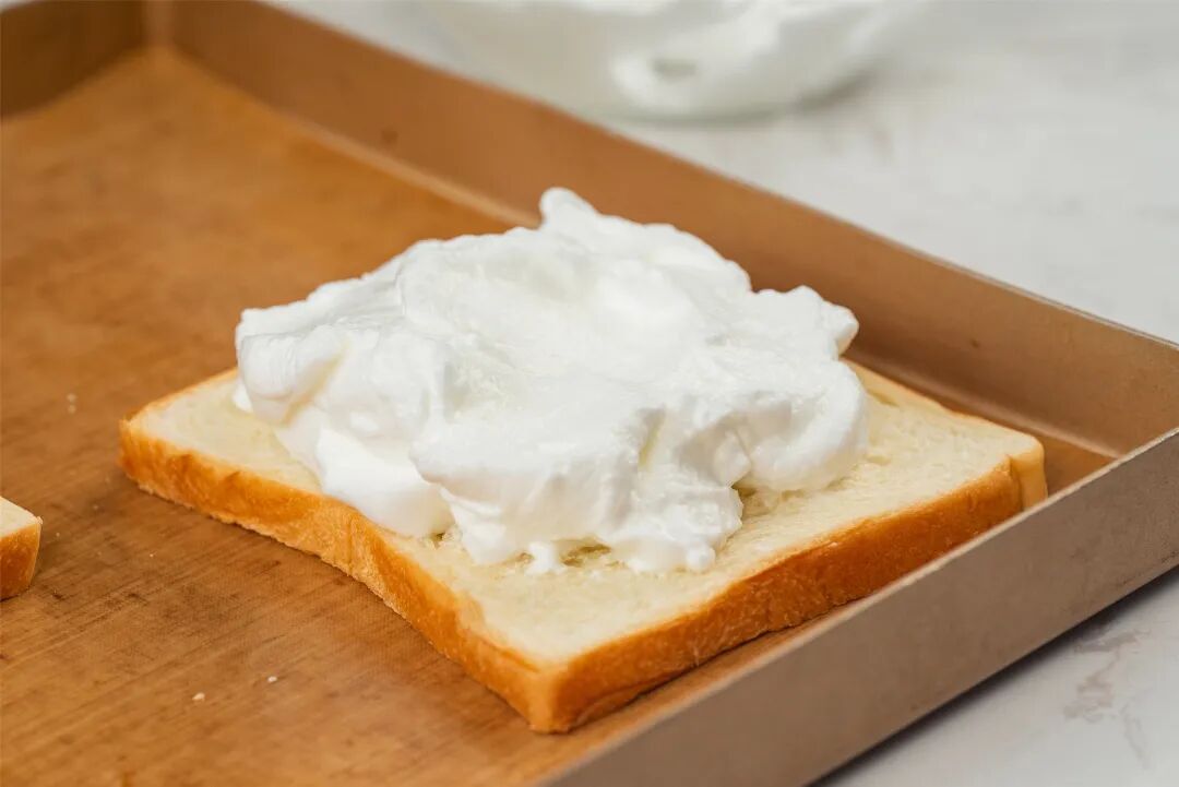3、吐司片放入烤盘中,把打发好的蛋白霜挖到土司表面