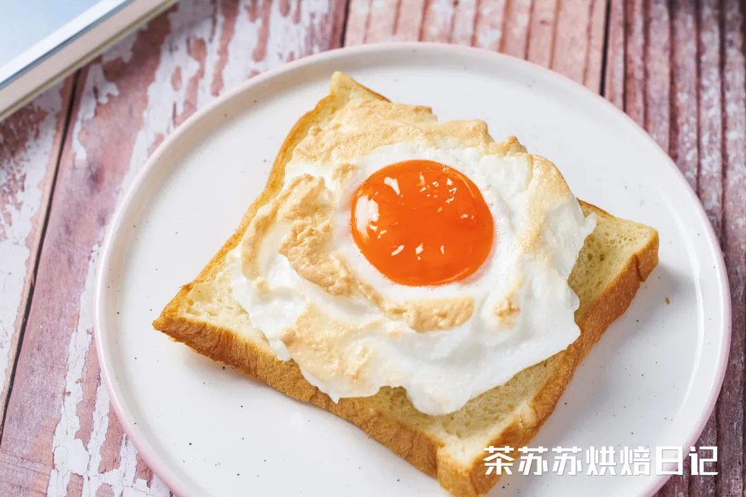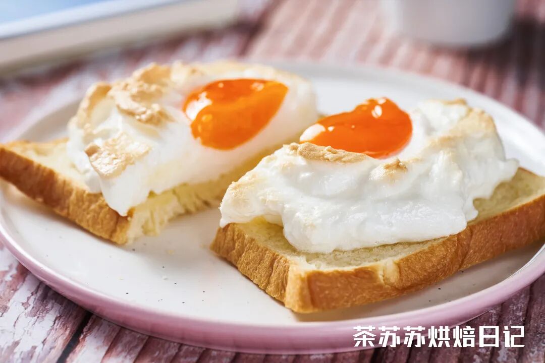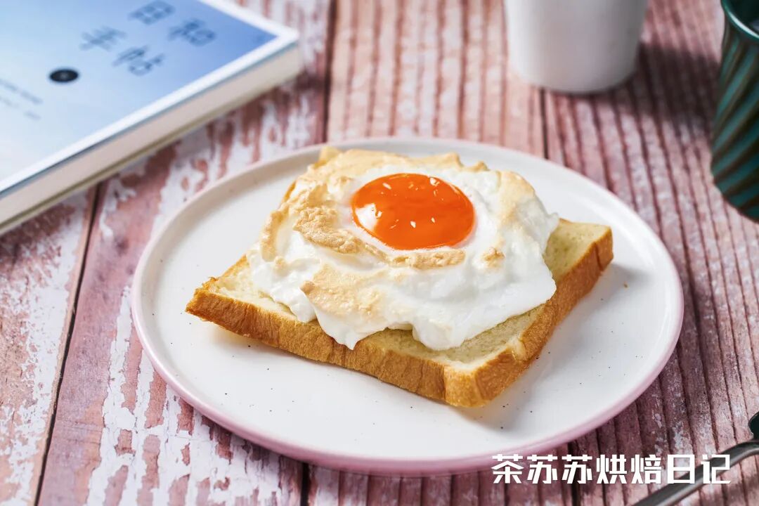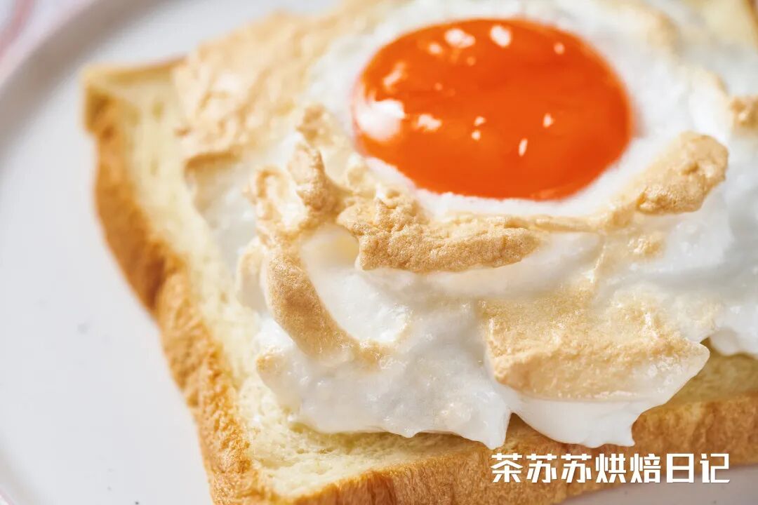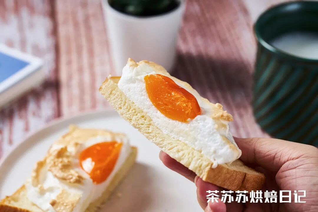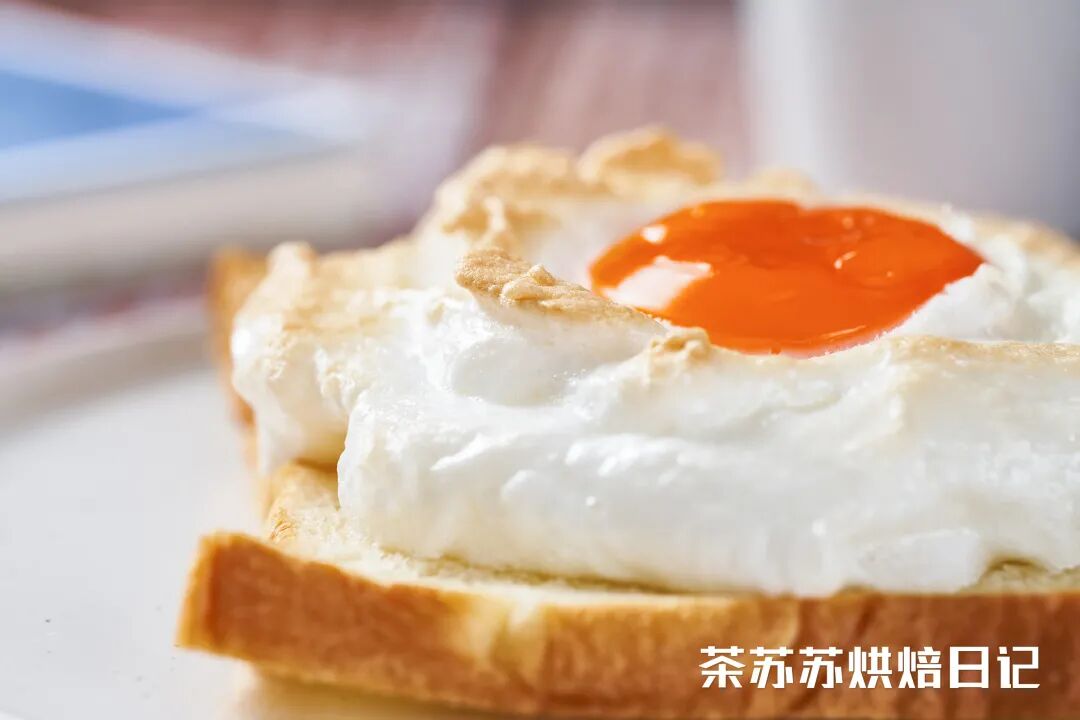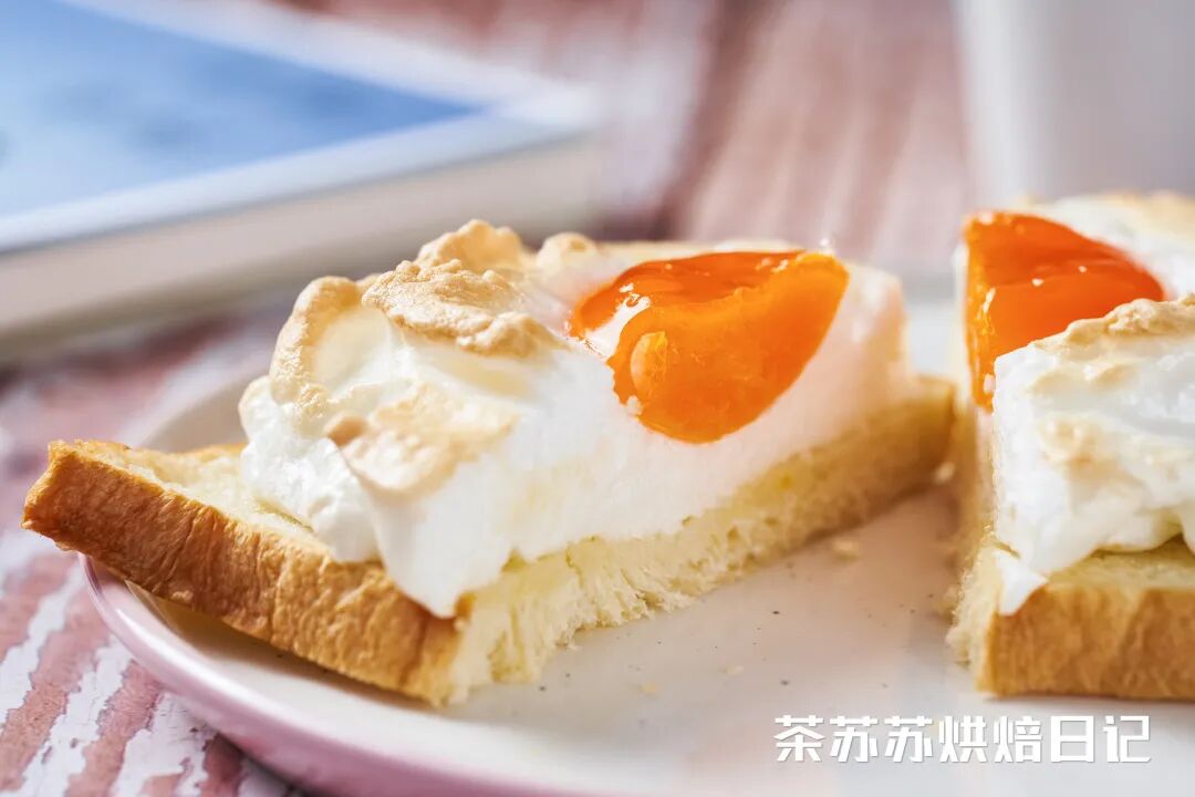 吐司经过烘烤微微翘着角,承载着被烤得金黄的蛋白霜,非常和谐。