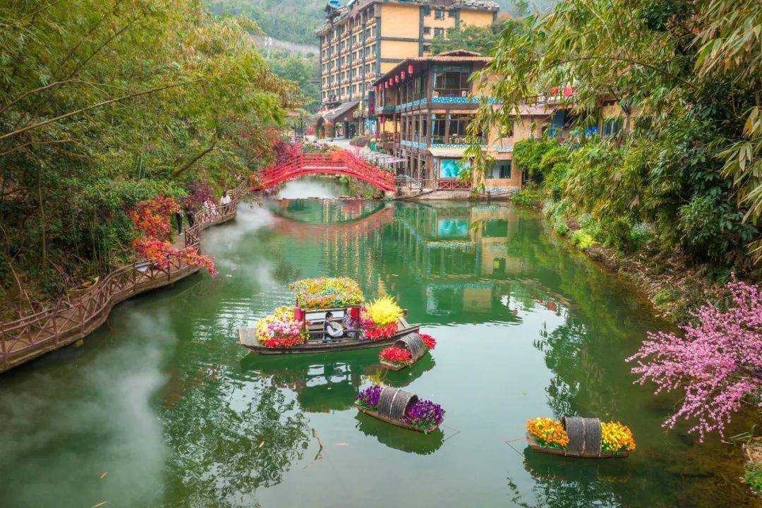 ④ 网红河谷在网红河谷层层水雾中远观青山叠翠 近赏花溪叠瀑一幕幕温馨的光景相互辉映构成了一幅绝美的古龙春光图