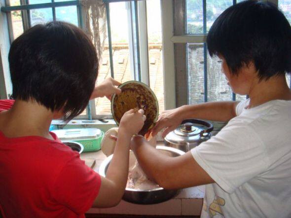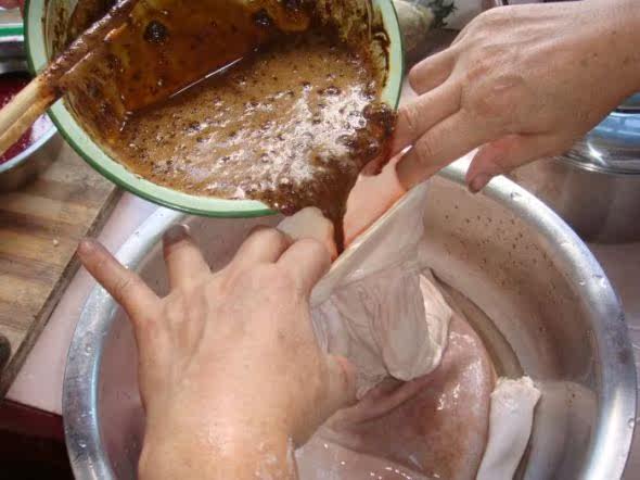婆婆跟潘小妹合作灌猪肚,好专业,这个我怎么学也学不来的!
