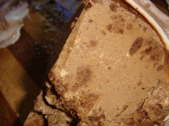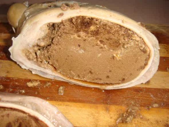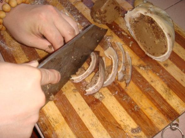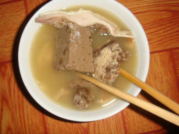 6、要吃的时候往锅里加少许盐,再把猪肚拿出来凉凉,切开来,里面的鸡蛋和养脾散凝固成块也一起切来配汤吃。