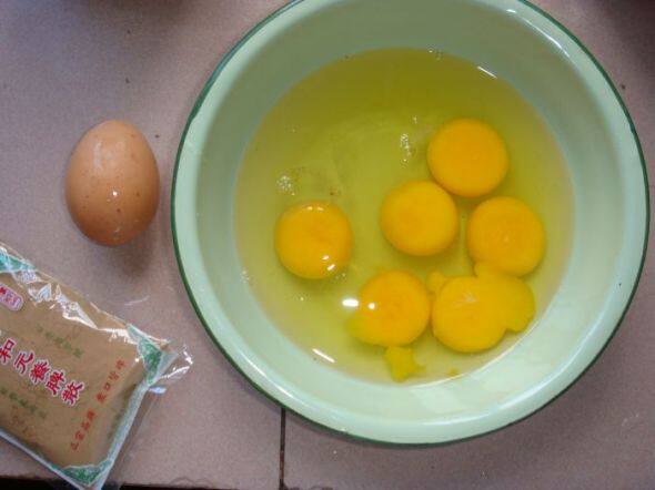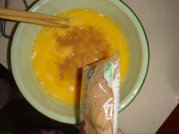 2、把鸡蛋打匀,然后加入养脾散一起打散。