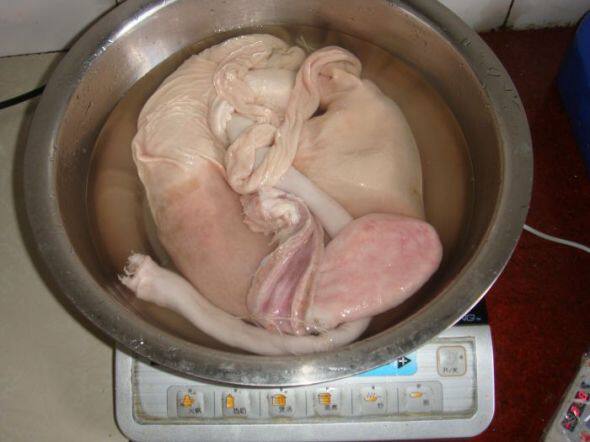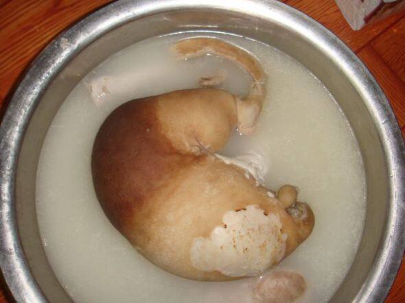 3、把洗好的猪肚开口一边先用针线缝起来,然后,在另外一个开口倒入鸡蛋养脾散浆。注意哦。这个有点难度,如果没有处理好,可能煮好了,是个半成品哦