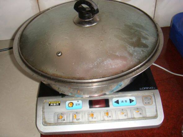 4、灌完养脾散浆,把另外一个开口也缝起来,放到锅里,加入清水,开始煮了,因为今天的这个猪肚太大,炖锅放不了,只好放大盆里煮了!